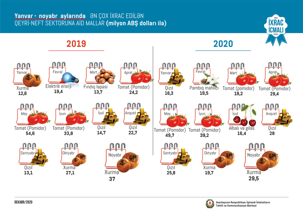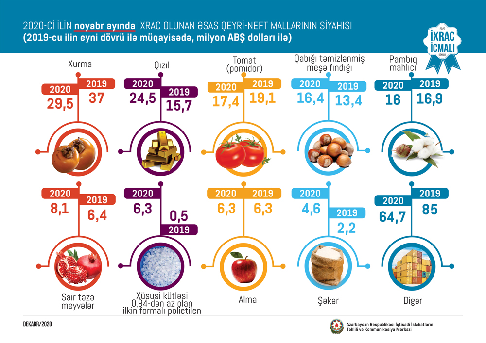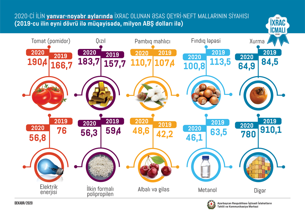 2020-ci ilin yanvar-noyabr ayları ərzində ixrac edilən qeyri-neft sektoruna aid malların siyahısında tomat (pomidor) (190,4 milyon ABŞ dolları) birinci, qızıl (sikkə kəsilməsində istifadə olunmayan, digər emal olunmamış formalarda – 183,7 milyon ABŞ dolları) ikinci və pambıq mahlıcı (110,7 milyon ABŞ dolları) üçüncü olub.