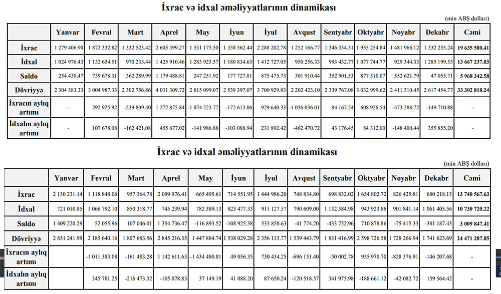 Ötən il ixrac 5 milyard 895 milyon 13 min dollar, idxal isə 2 milyard 936 milyon 517 min dollar azalıb.