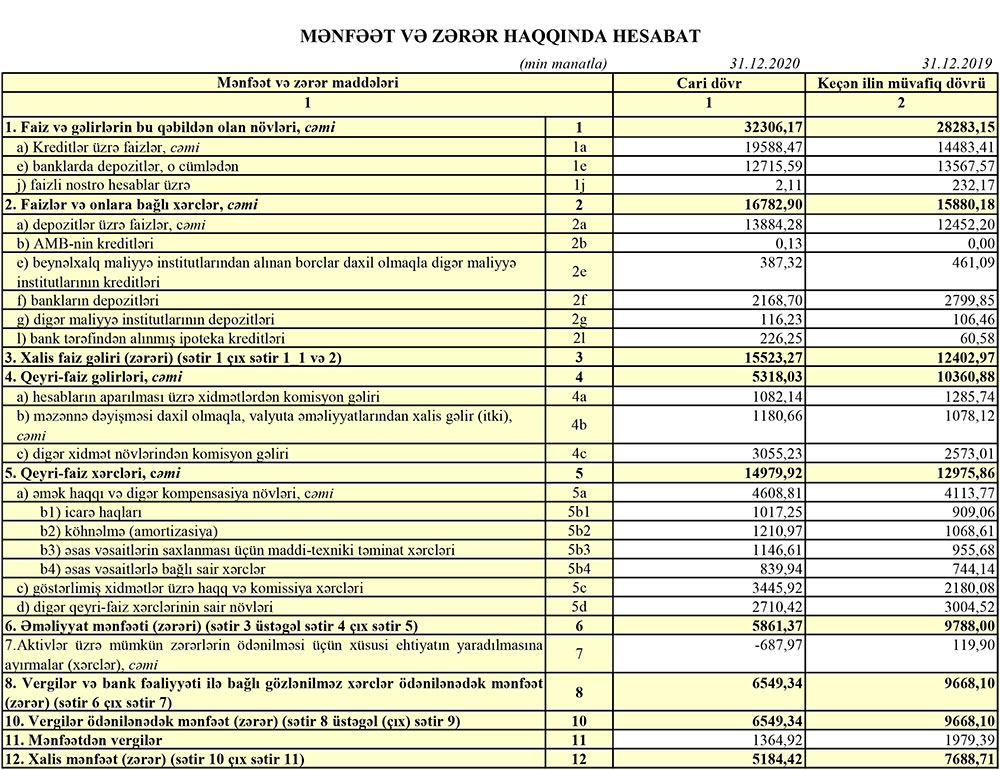 2019-cu ildə faiz xərcləri 15 milyon 880 min manat ikən, 2020-ci ildə 16 milyon 783 min manat, 2019-cu ildə qeyri-faiz xərcləri 12 milyon 976 min manat ikən 2020-ci ildə 14 milyon 980 min manat təşkil edib.