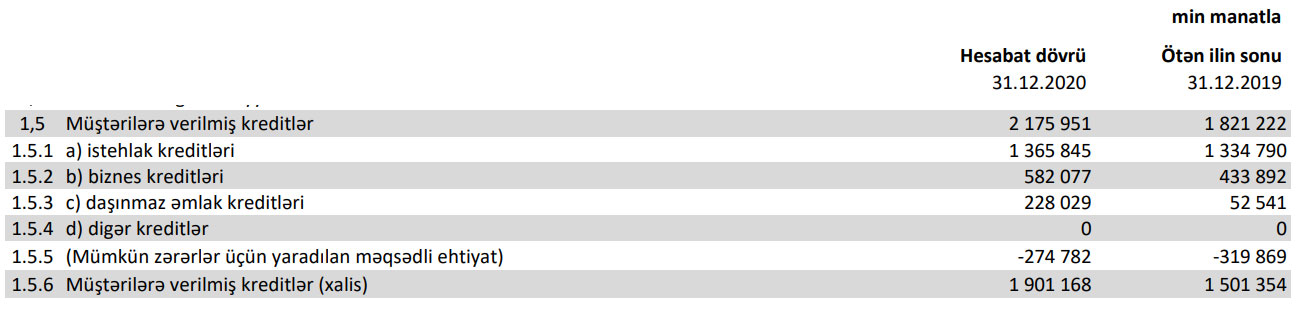 Marja Bankın maliyyə göstəricilərinə istinadən xəbər verir ki, 2019-cu illə müqayisədə 2020-ci ildə “Kapital Bank”ın müştərilərə verdiyi cəmi kreditlər 354 milyon 729 min manat artaraq 2 milyard 175 milyon 951 min manata çatıb.
