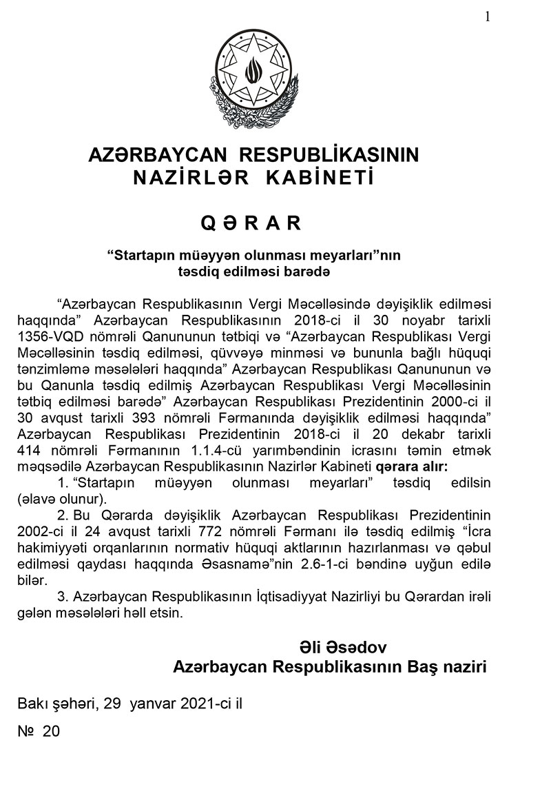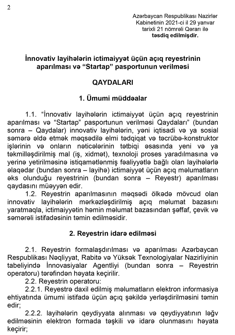Azərbaycan Respublikasının Nazirlər Kabineti “İnnovativ layihələrin ictimaiyyət üçün açıq reyestrinin aparılması və “Startap” pasportunun verilməsi Qaydaları”nın və “Startapın müəyyən olunması meyarları”nın təsdiq edilməsi barədə qərarlar qəbul edib.
