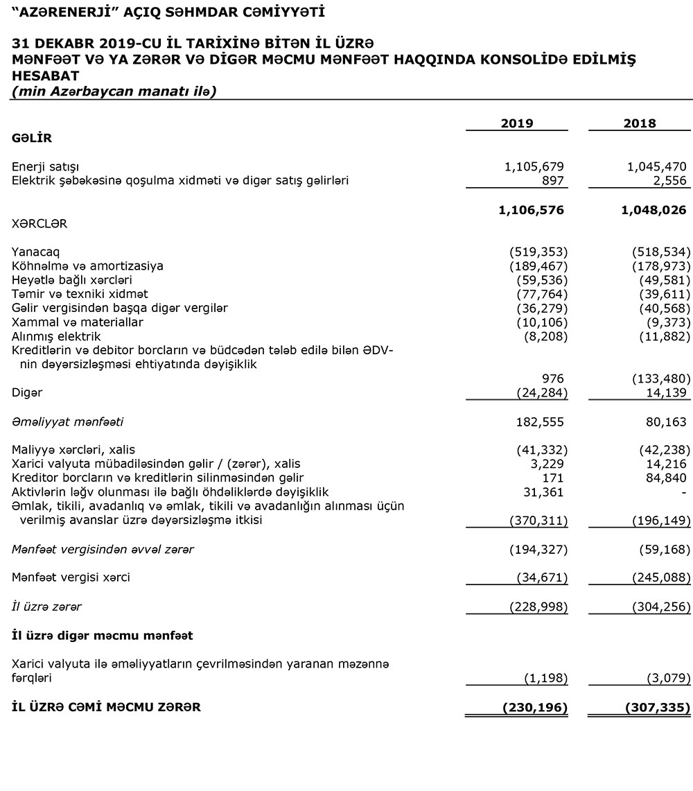 “Azərenerji” ASC 2019-cu ili 228 milyon 998 min manat zərərlə başa vurub.