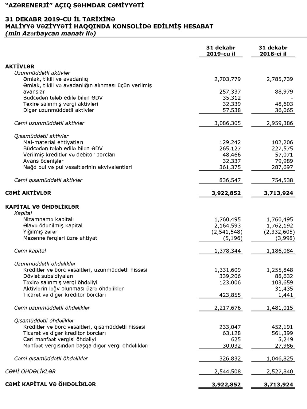 2020-ci il yanvarın 1-nə “Azərenerji”nin aktivləri 3 milyard 922 milyon 852 min manat olub ki, bu da 1 il əvvələ nisbətən 5,6% çoxdur. Hesabat dövründə səhmdar cəmiyyətinin öhdəlikləri 0,7% artaraq 2 milyard 54 milyon 508 milyon manata, balans kapitalı isə 16,2% artaraq 1 milyard 378 milyon 344 min manata çatıb.