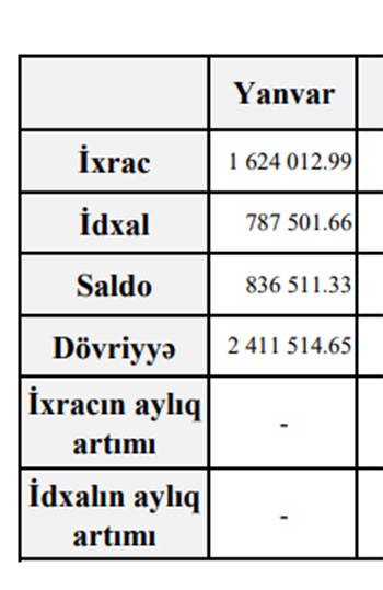Xatırladaq ki, 2020-ci ilin Yanvar ayında ticarət əməliyyatlarının həcmi 2 milyard 851 milyon 118 min ABŞ dolları, o cümlədən, idxal 720 milyon 913 min ABŞ dolları, ixrac 2 milyard 130 milyon 205 min min ABŞ dolları təşkil etmişdi.
