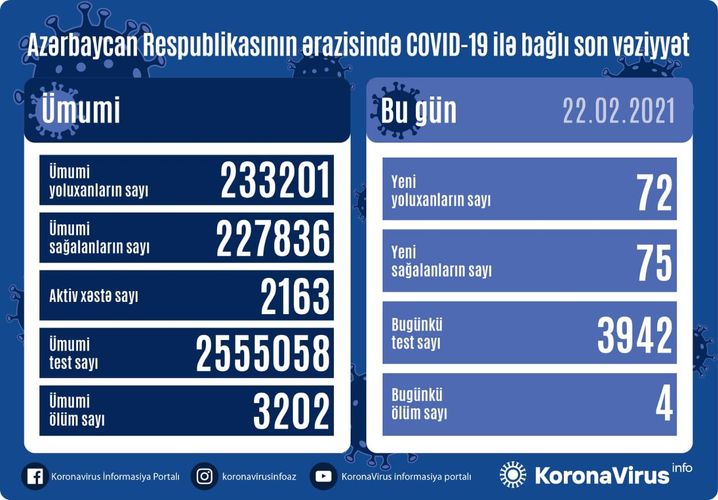 Azərbaycan Respublikasında koronavirus (COVID-19) infeksiyasına 72 yeni yoluxma faktı qeydə alınıb, 75 nəfər müalicə olunaraq sağalıb.