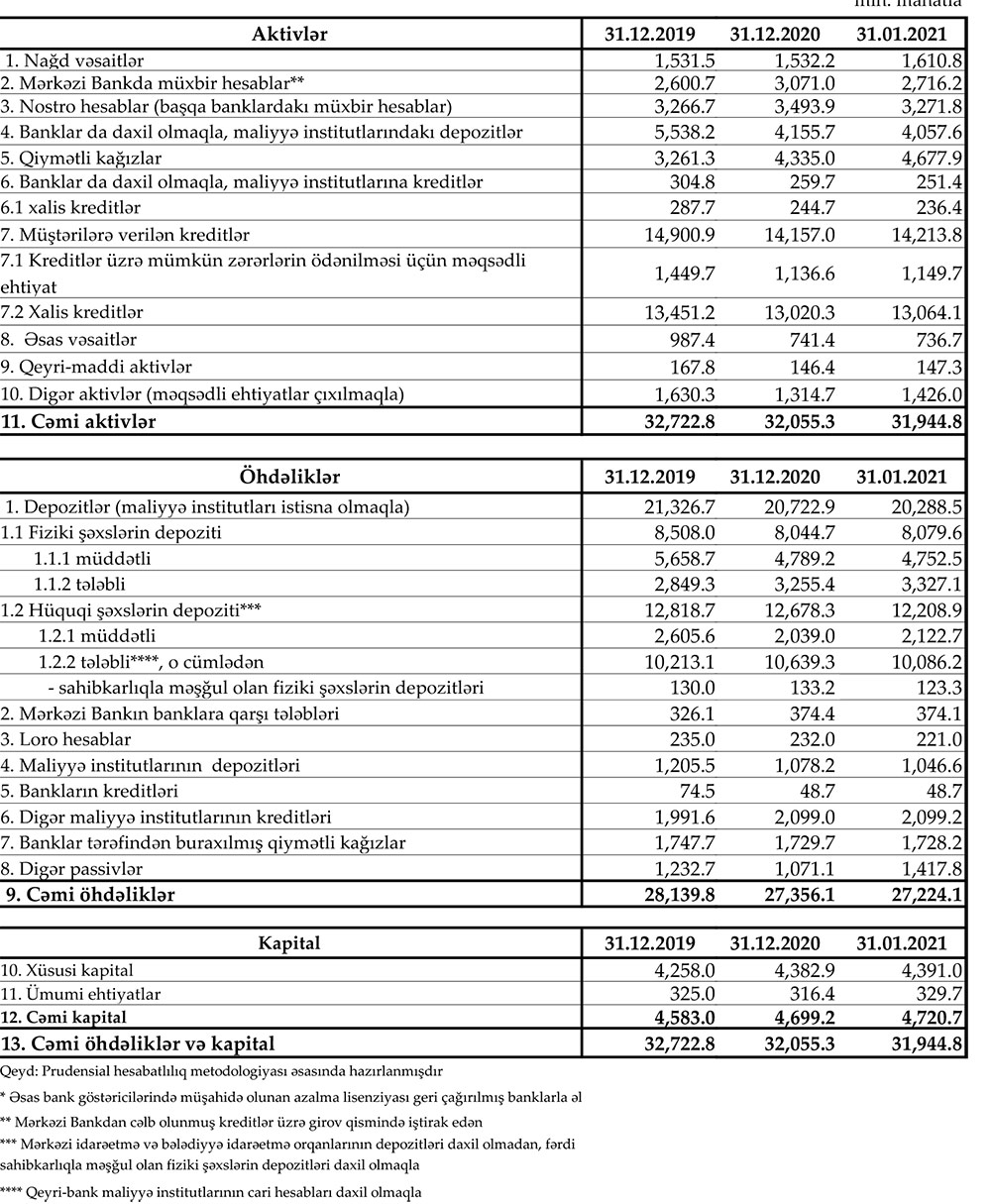 Yanvarda hüquqi şəxslərin depozitləri isə 469,4 milyon manata azalaraq 12 milyard 208,9 milyon manata geriləyib. O cümlədən hüquqi şəxslərin tələbli depozitləri 553,1 milyon manat azalaraq 10 milyard 86.2 milyon manata düşüb.