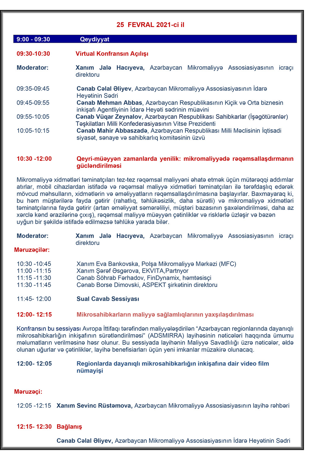 25 fevral 2021-ci il tarixində virtual platformada “Pandemiya sonrası perspektivlər: Rəqəmsallaşmağa doğru” adlı 10-cu Azərbaycan Mikromaliyyə Konfransı keçiriləcək.Azərbaycan Mikromaliyyə Assosiasiyası (AMFA) Avropa İttifaqı tərəfindən maliyyələşdirilən “Azərbaycan regionlarında dayanıqlı mikrosahibkarlığın inkişafının sürətləndirilməsi” (ADSMIRRA) layihəsi çərçivəsində həyata keçirilən “Pandemiyası sonrası Perspektivlər: Rəqəmsallaşmağa doğru” mövzusuna həsr edilmiş 10-cu Azərbaycan Mikromaliyyə Konfransının keçiriləcək.