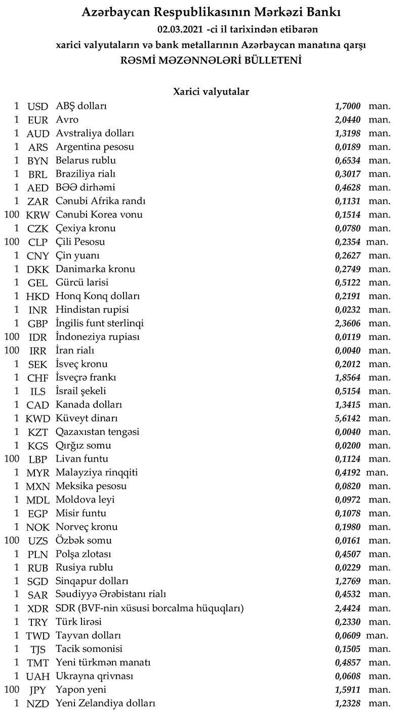 Mərkəzi Bank 2026-cı ilin ilk iş gününün rəsmi məzənnəsini açıqladı