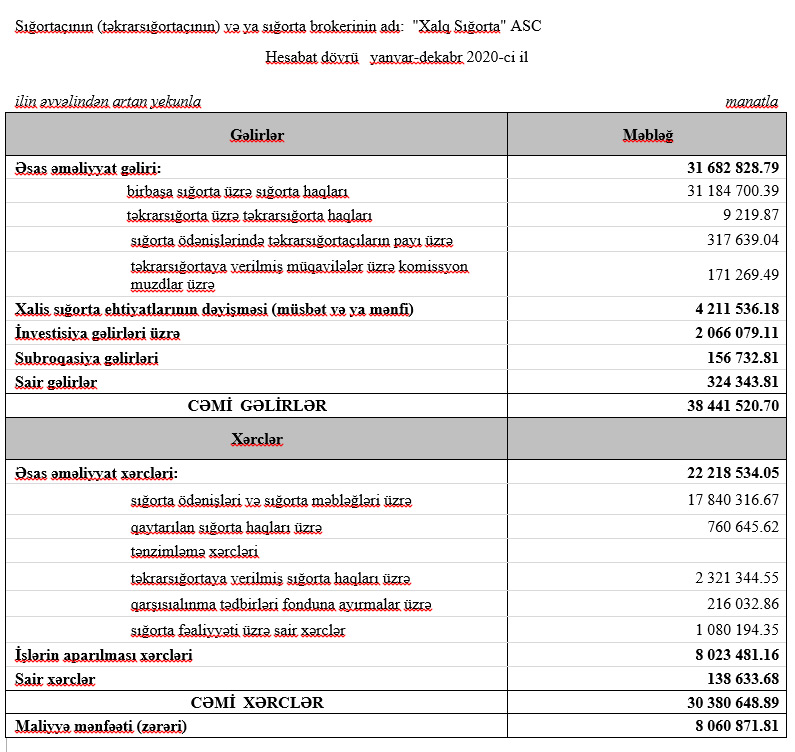 “Xalq Sığorta” ASC 2020-ci ili 8 milyon 61 min manat xalis mənfəət ilə başa vurub. Halbuki, şirkət 2019-cu ili 17 milyon 656 min manat xalis zərər ilə bağlamışdı. “Xalq Sığorta” 2018-ci ildə isə 2 milyon 250 min manat xalis mənfəət əldə etmişdi.