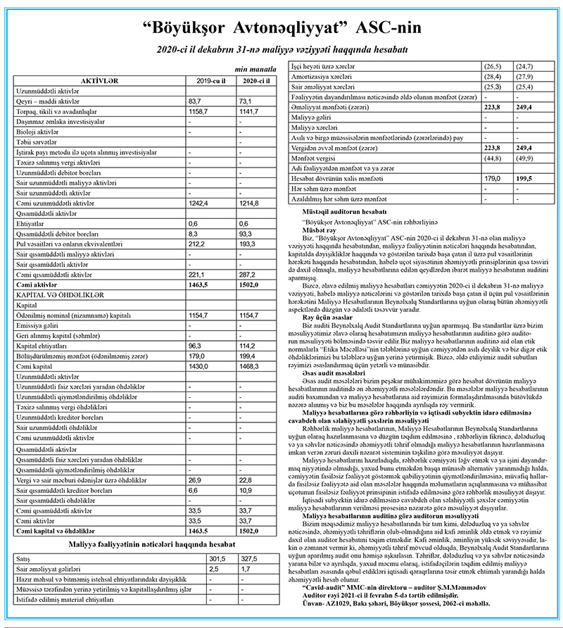 “Böyükşor Avtonəqliyyat” ASC 2020-ci ili 179 min manat xalis mənfəət ilə başa vurub. Şirkət 2019-cu ili 199,5 min manat xalis mənfəət ilə bağlamışdı.