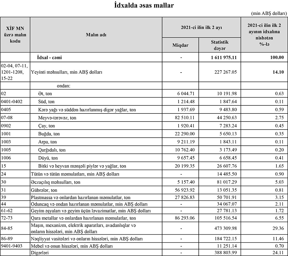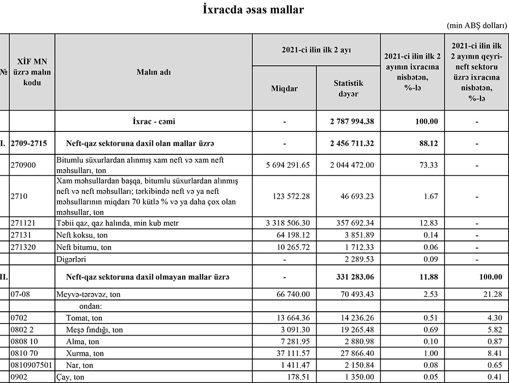 2021-ci ilin yanvar-frvral aylarında Azərbaycanın ən çox ixrac və idxal etdiyi mallar.