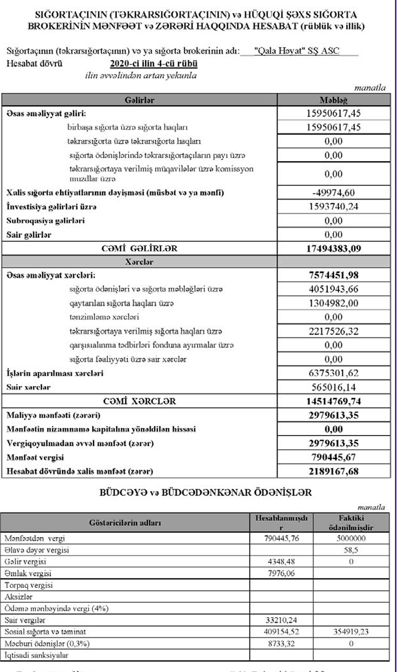 “Qala Həyat” sığorta şirkəti 2020-ci ili 2 milyon 189 min manat xalis mənfəət ilə başa vurub. Şirkət 2019-cu ili 2 milyon 621 min manat xalis mənfəət ilə bağlamışdı (xalis mənfəəti 16,5% azalıb).
