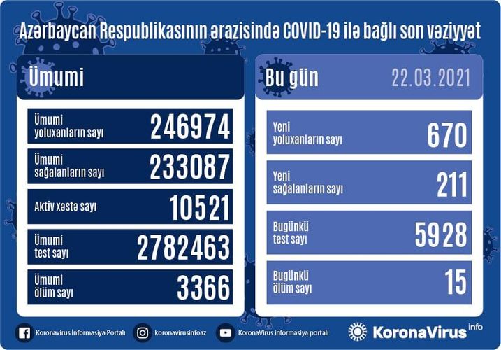 Azərbaycan Respublikasında koronavirus (COVID-19) infeksiyasına 670 yeni yoluxma faktı qeydə alınıb, 211 nəfər müalicə olunaraq sağalıb.
