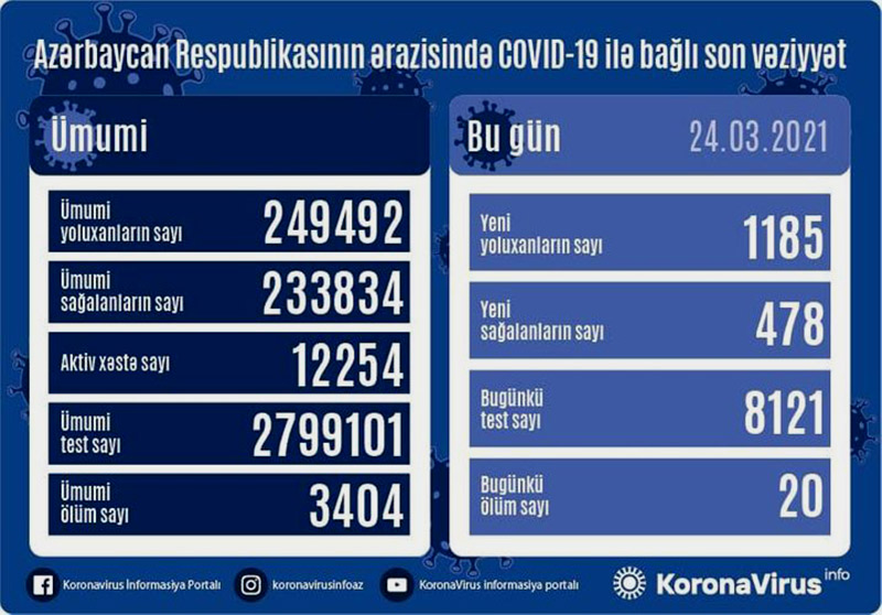 Azərbaycanda bir gündə 1185 nəfər COVID-19-a yoluxub, 20 nəfər vəfat edib.Azərbaycan Respublikasında koronavirus (COVID-19) infeksiyasına 1185 yeni yoluxma faktı qeydə alınıb, 478 nəfər müalicə olunaraq sağalıb.
