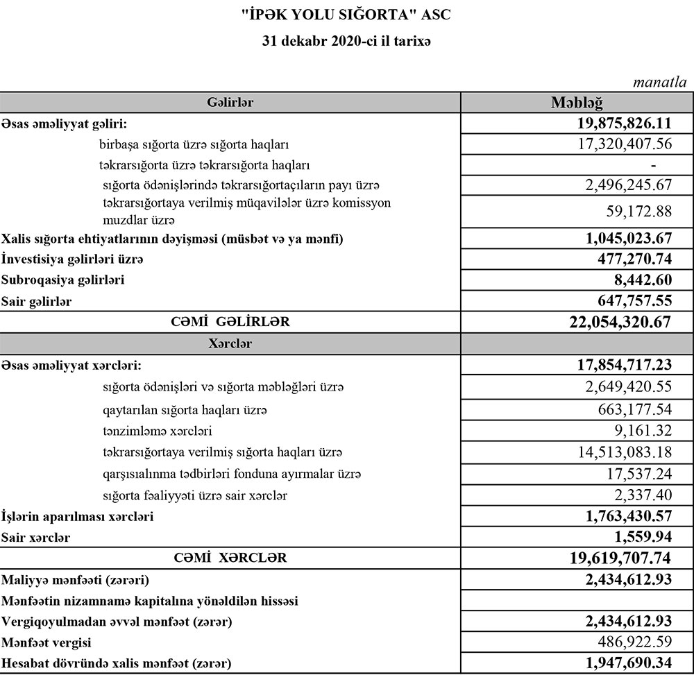 Marja Şirkətin maliyyə göstəricilərinə istinadən xəbər verir ki, 2019-cu ildə “İpək Yolu Sığorta”nın cəmi əməliyyat gəlirləri 39 milyon 191 min manat ikən, 2020-ci ldə 22 milyon 54 min manata düşüb. Şirkətin cəmi əməliyyat xərcləri isə 38 milyon 95 min manatdan 19 milyon 620 min manata geriləyib.