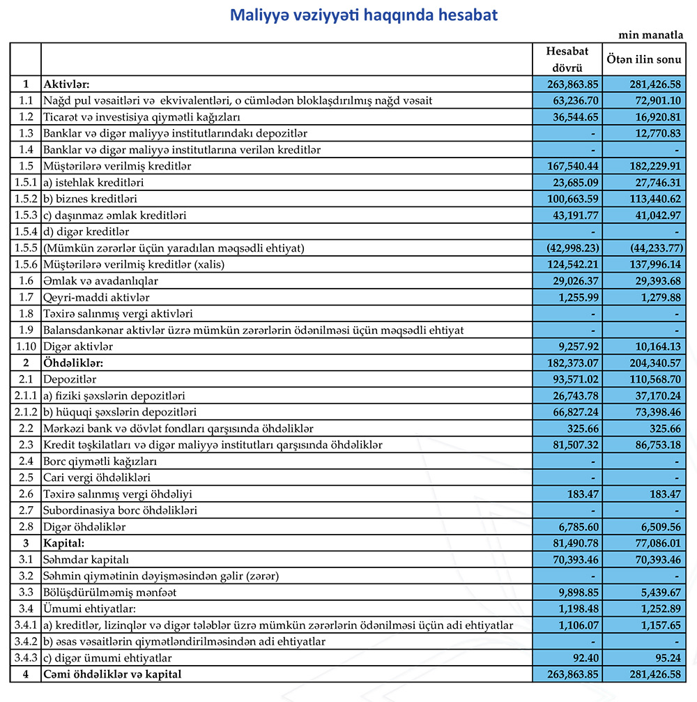 Müqayisə üçün qeyd edək ki, 2020-ci ilin 1-ci rübündə AFB Bankın cəmi əməliyyat gəlirləri 9 milyon 564 min manat, cəmi əməliyyat xərcləri 4 milyon 904 min manat, əməliyyat mənfəəti 4 milyon 660 min manat təşkil etmişdi. Bank əməliyyat mənfəətindən 2 milyon 106 min manat mümkün zərərlər üçün yaradılan məqsədli ehtiyatlara ayırdığından 2 milyon 553 min manat mənfəəti formalaşmışdı.