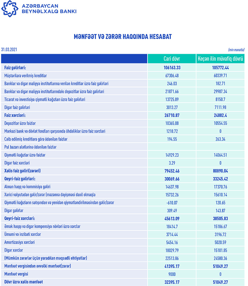 2021-ci ilin ilk rübündə “Azərbaycan Beynəlxalq Bankı”nın cəmi əməliyyat gəlirləri (136 milyon 233 min manat) cəmi əməliyyat xərclərini (72 milyon 324 min manat) üstələdiyindən Bankın 63 milyon 909 min manat əməliyyat mənfəəti yaranıb. Əməliyyat mənfəətindən 22 milyon 514 min manat mümkün zərərlər üçün yaradılan məqsədli ehtiyatlara ayrılıb və 9 milyon manat mənfəət vergisi ödənilib. Beləliklə, “Azərbaycan Beynəlxalq Bankı” ilk rübü 32 milyon 395 min manat xalis mənfəətlə bağlayıb.