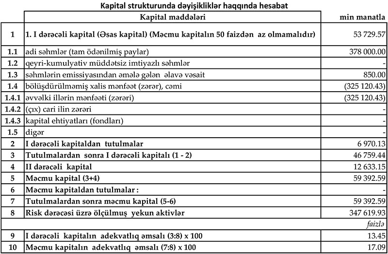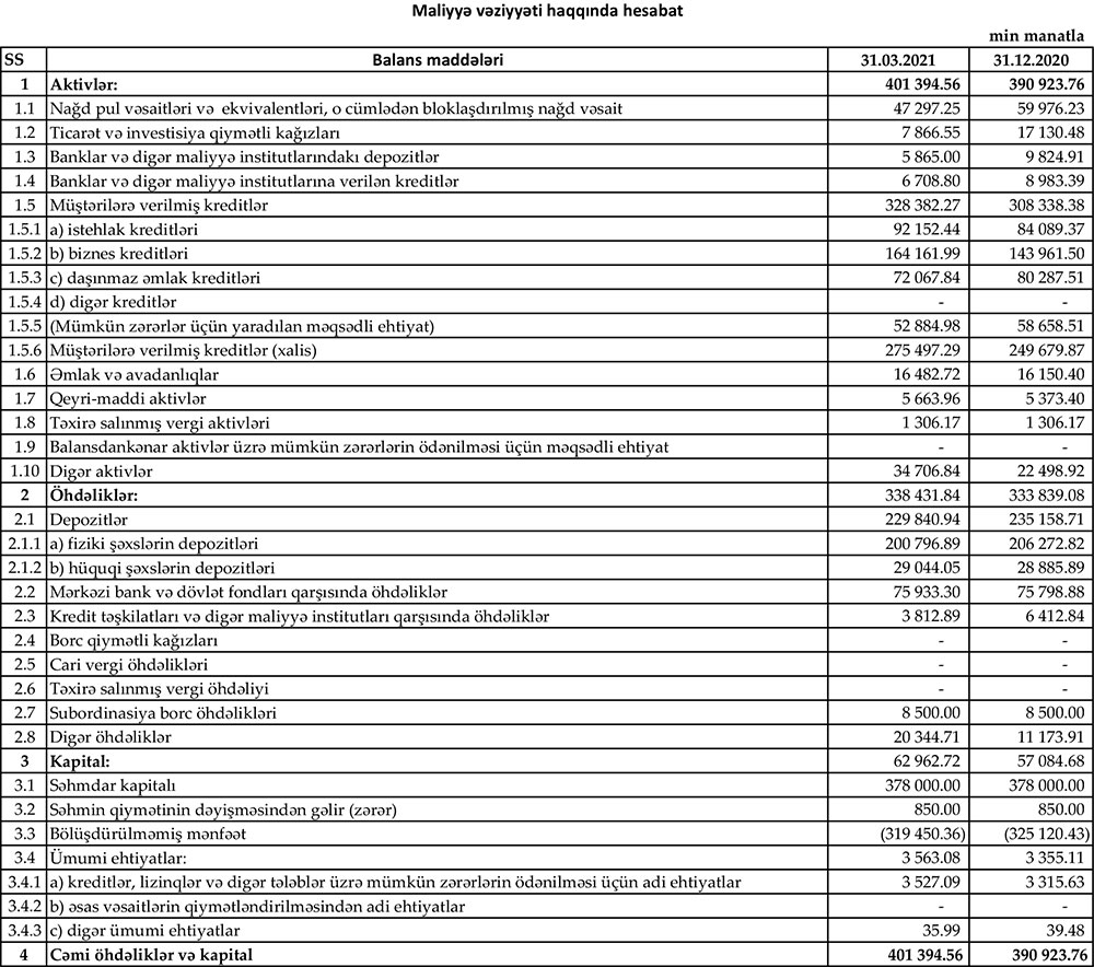 İlk rübdə Bankda depozitlər ötən ilin sonundakı 235 milyon 158 min manatdan 229 milyon 840 min manata geriləyib. Bankda həm fiziki, həm də hüquqi şəxslərin depozitləri azalıb.