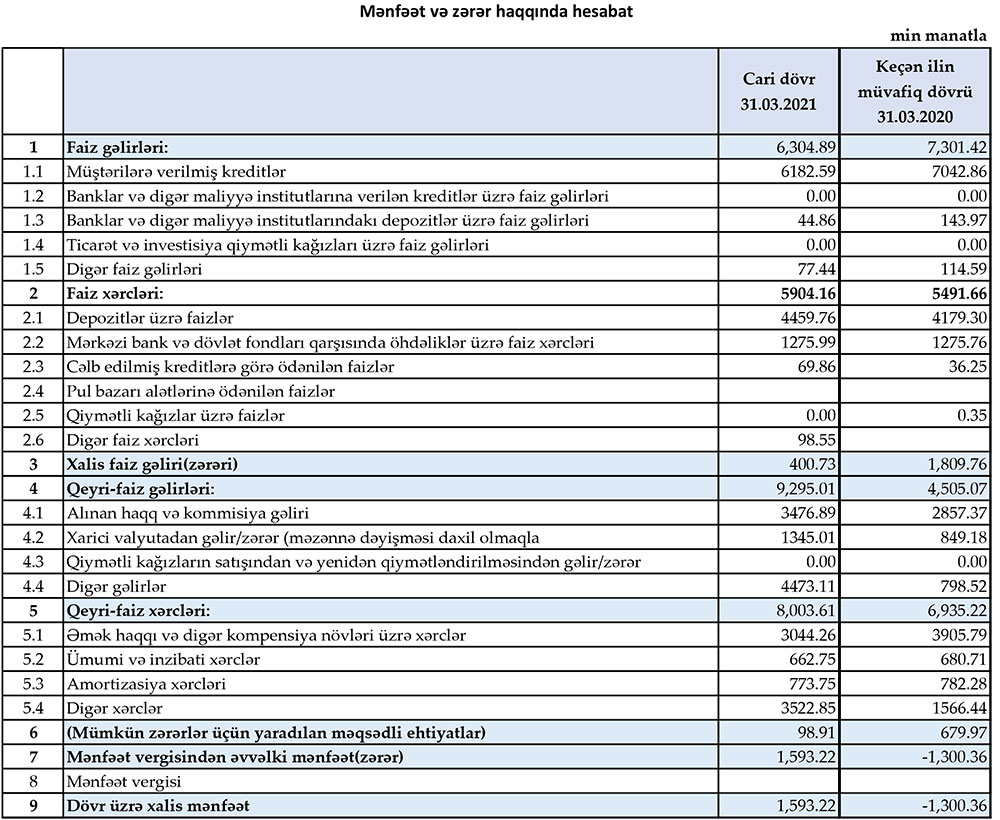 Müqayisə üçün qeyd edək ki, 2020-ci ilin ilk rübündə Muğanbank“ın cəmi əməliyyat gəlirləri 11 milyon 806 min manat, cəmi əməliyyat xərcləri 12 milyon 427 min manat, xərclər gəlirləri üstələdiyindən əməliyyat zərəri 621 min manat təşkil etmişdi. Bankın mümkün zərərlər üçün yaradılan məqsədli ehtiyatlara 679 min manat ayrılması zərərin 1 milyon 300 min manata yüksəlməsinə səbəb olmuşdu.