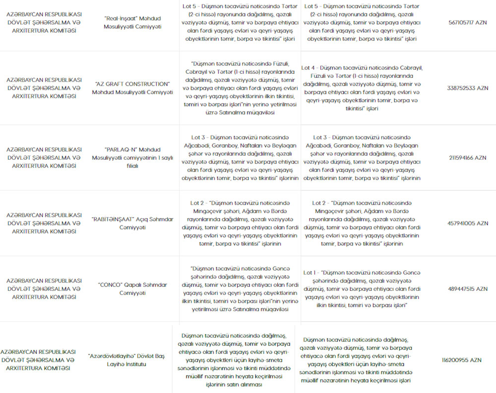 Dövlət Şəhərsalma və Arxitertura Komitəsi düşmən təcavüzü nəticəsində dağılmış, qəzalı vəziyyətə düşmüş, təmir və bərpaya ehtiyac olan fərdi yaşayış evləri və qeyri-yaşayış obyektleri üçün layihə-smeta sənədlərinin işlənməsi və tikinti müddətində müəllif nəzarətinin həyata keçirilməsi (1), eləcə də Mingəçevir şəhərində, Ağdam və Bərdə rayonlarında (2), Gəncə şəhərində (3), Tərtər rayonunda (4), Füzuli, Cəbrayıl və Tərtər rayonlarında (5), Naftalan şəhərində, Ağcabədi, Goranboy, və Beyləqan rayonlarında (6) dağıdılmış, qəzalı vəziyyətə düşmüş, təmir və bərpaya ehtiyacı olan fərdi yaşayış evləri və qeyri-yaşayış obyektlərinin təmir, bərpa və tikintisi ilə bağlı elan etdiyi 6 açıq tenderə yekun vurub.