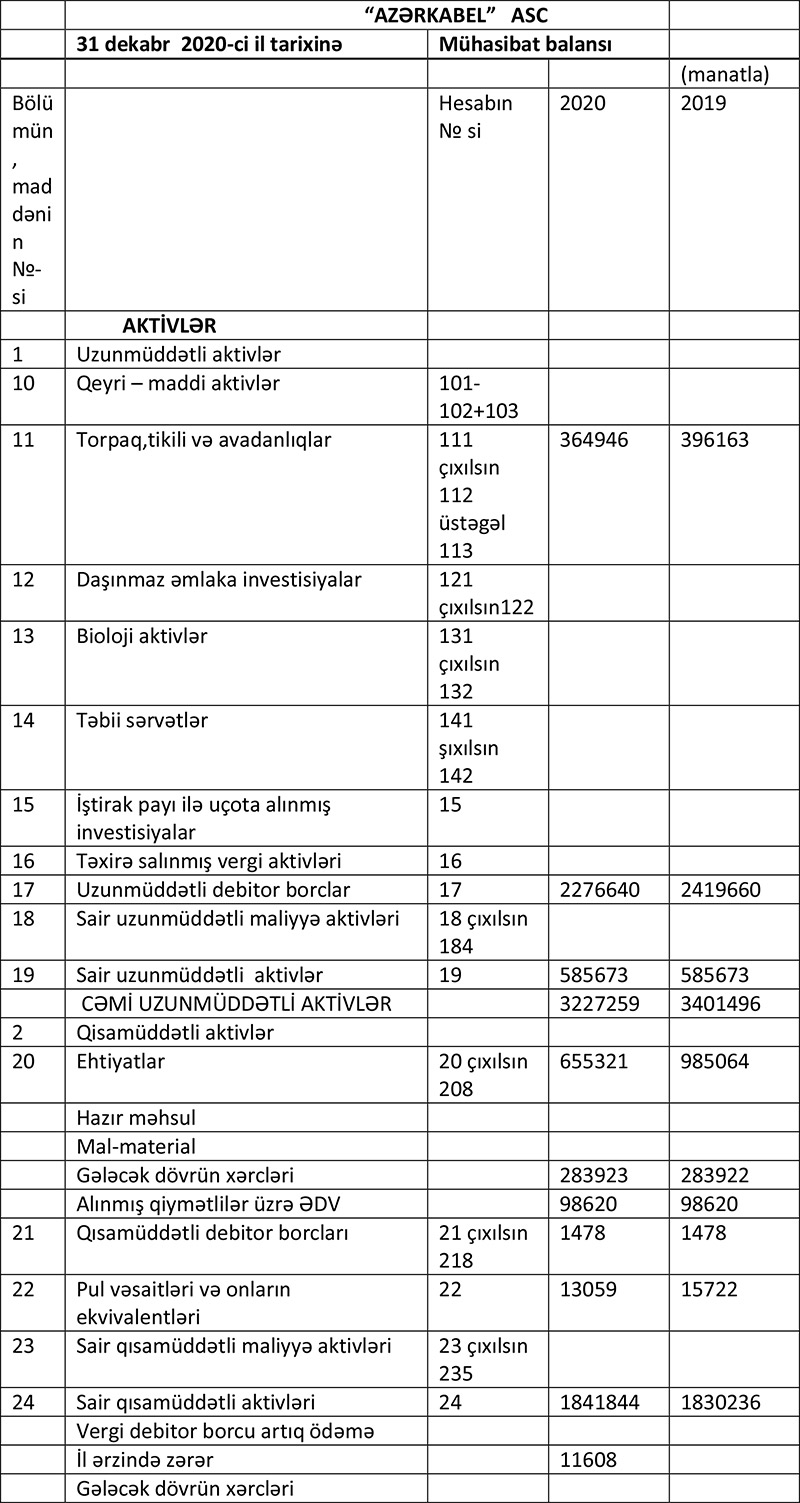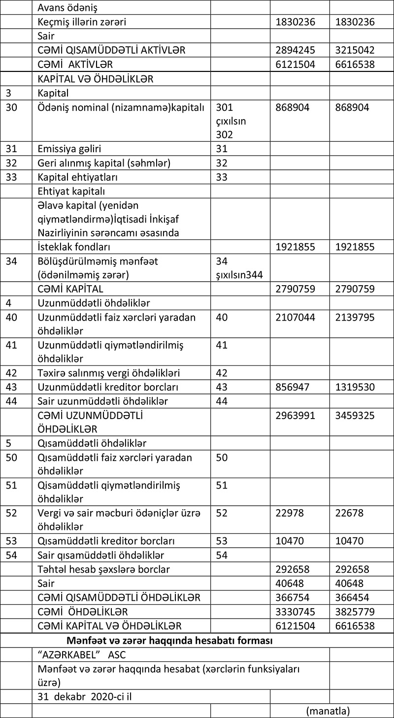 "Azərkabel" ASC 2020-ci ili 11 min 609 manat xalis zərər ilə başa vurub. ASC 2019-cu ili 500 min 192 manat xalis mənfəət ilə bağlamışdı.