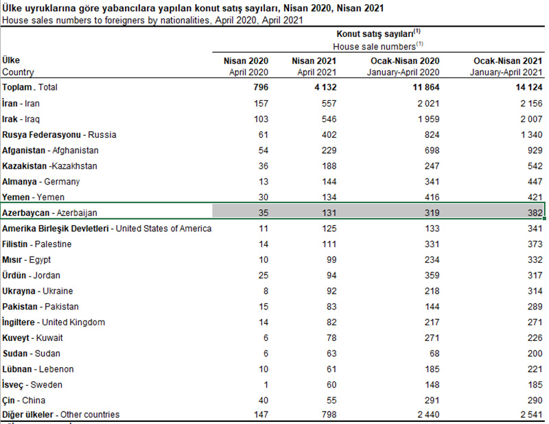 2021-ci ilin yanvar-aprel aylarında azərbaycanlılar Türkiyədə 382 mənzil alıblar. 2020-cu ilin eyni dövründə azərbaycanlılar Türkiyədə 319 mənzil almışdılar.