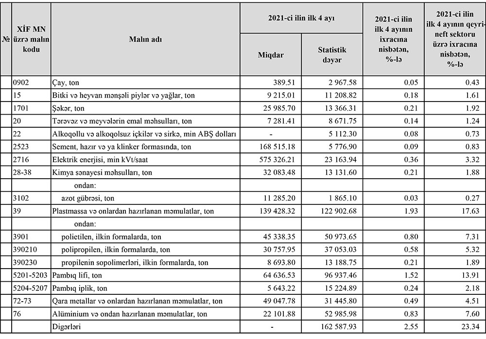 2021-ci ilin Aprel ayında ixrac 2021-ci ilin ötən dövründə ən yüksək məbləğli aylıq ixrac olub. Belə ki, yanvar-mart dövründə aylıq 1 milyard 164 milyon dollar -1 milyard 624 milyon dollar civarında olmuş aylıq ixrac apreldə 2 milyard 226 milyon 327 min dollara yüksəlib. Mart ilə müqayisədə Apreldə ixrac 1,6 dəfə artıb.