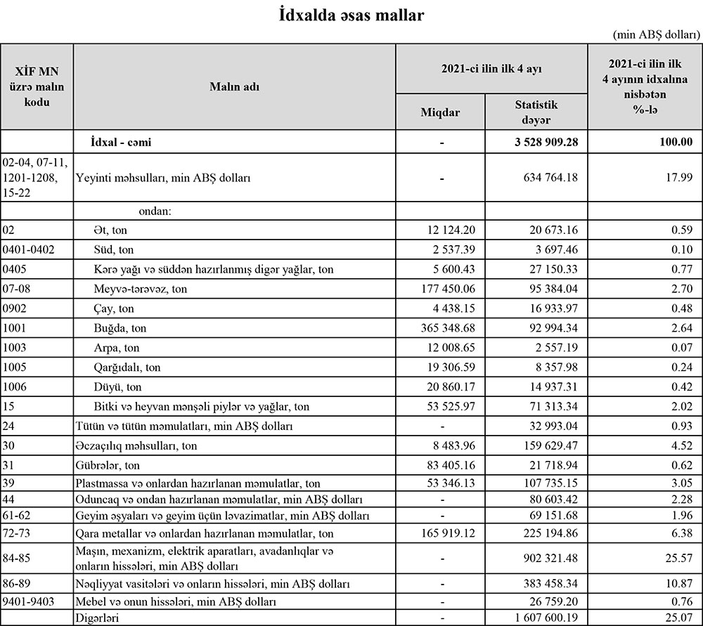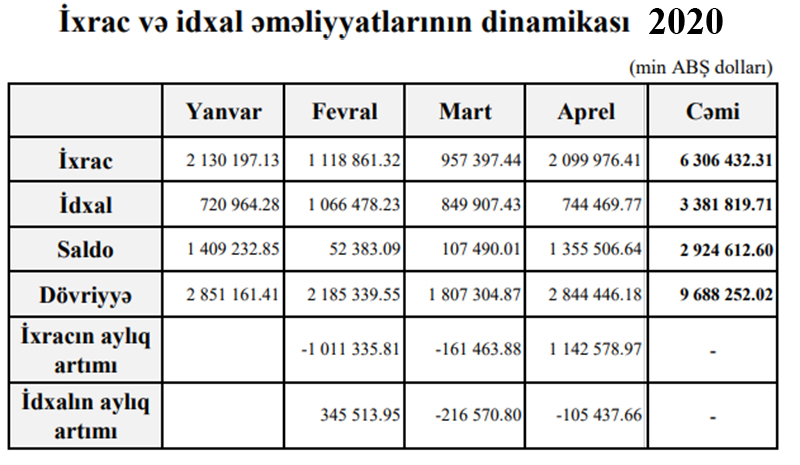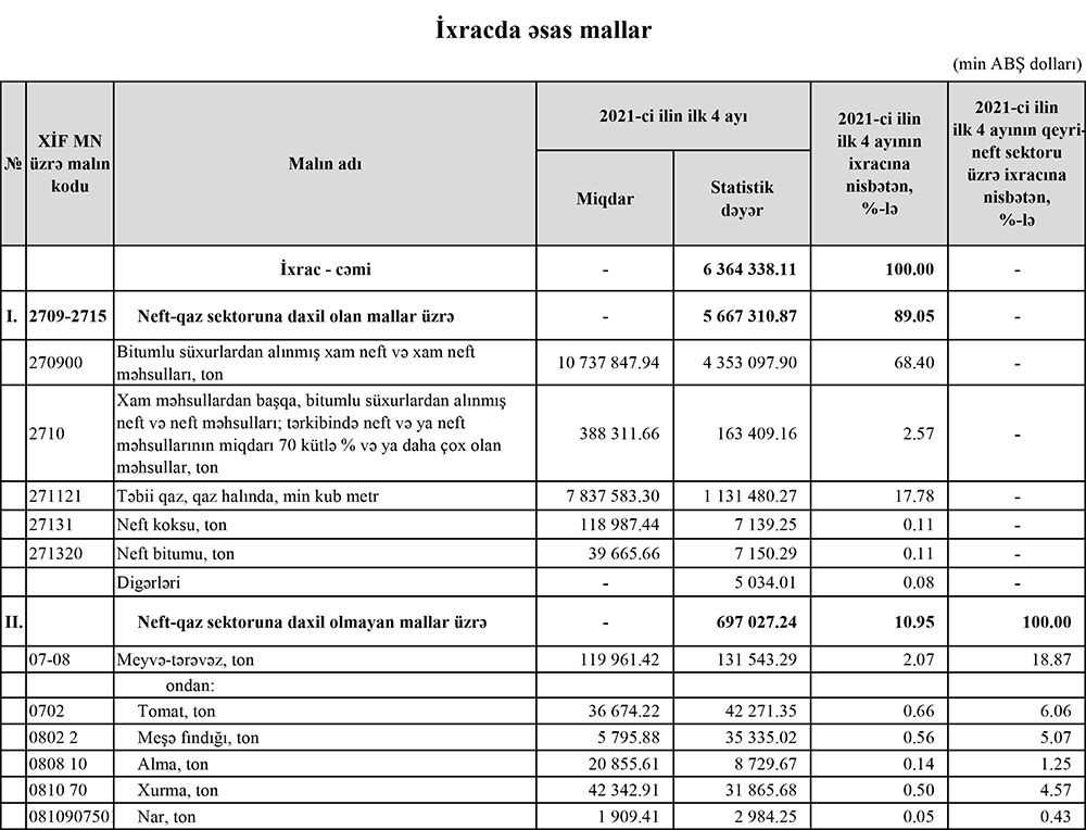 Marja Dövlət Gömrük Komitəsinin aylıq hesabatına istinadən xəbər verir ki, 2021-ci ilin ilk 4 ayında idxal 3 milyard 528 milyon 909 min ABŞ dolları (2020-ci ilin ilk 4 ayında 3 milyard 381 milyon 820 min ABŞ dolları), ixrac isə 6 milyard 364 milyon 338 min ABŞ dolları (2020-ci ilin ilk 4 ayında 6 milyard 306 milyon 432 min ABŞ dolları) təşkil edib. İxracın 90%-ə yaxını neft-qa sektoruna aid mallar üzrə olub.