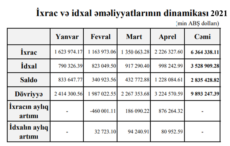 Lakin bu ilin ötən dövründə idxalın yüksək olması ilə əlaqədar olaraq Azərbaycanın xarici ticarət əməliyyatlarının həcmi cüzi artıb.2021-ci ilin ilk 4 ayında (yanvar-aprel) Azərbaycanın xarici ticarət əməliyyatlarının həcmi9 milyard 893 milyon 247 min ABŞ dolları təşkil edib. Ötən ilin eyni dövründə xarici ticarətin həcmi 9 milyard 688 milyon 252 min ABŞ dolları təşkil etmişdi.