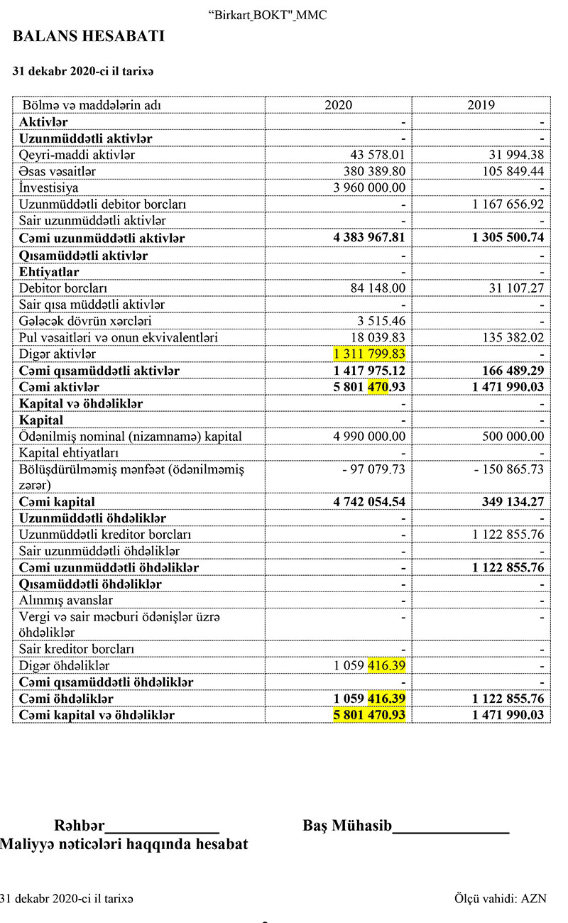 “Birkart BOKT” MMC-yə 2020-cu ildə 4 milyon 490 min manat sərmayə qoyulmuş və müəssisə tərəfindən 3 milyon 960 min manat kapital qoyuluşu ayrılmışdır.
