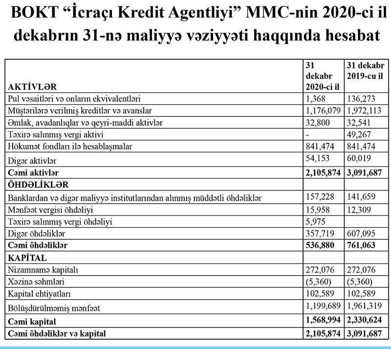 Bank Olmayan Kredit Təşkilatı “İcraçı Kredit Agentliyi” MMC 31 dekabr 2020-ci il tarixinə maliyyə vəziyyəti haqqında hesabatını dərc etdirib.