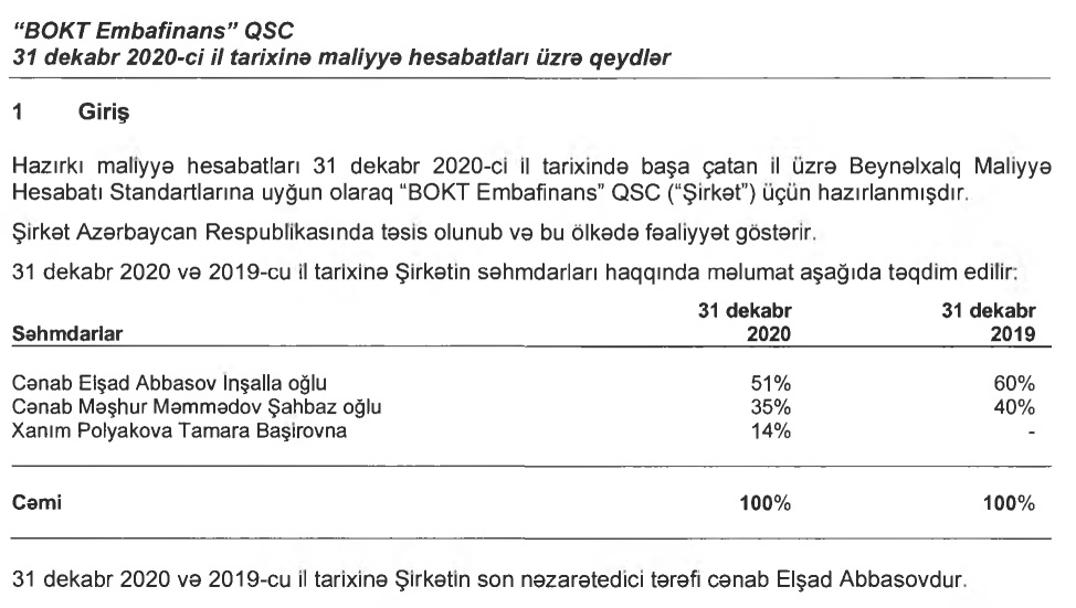 "Embafinans" QSC bank olmayan kredit təşkilatının (BOKT) səhmlərinin müvafiq olaraq 60%-nə və 40%-nə nəzarət edən Elşad Abbasov və Məşhur Məmmədov paylarının bir hissəsini yeni səhmdara satıb. Söhbət Tamara Polyakovadan gedir.