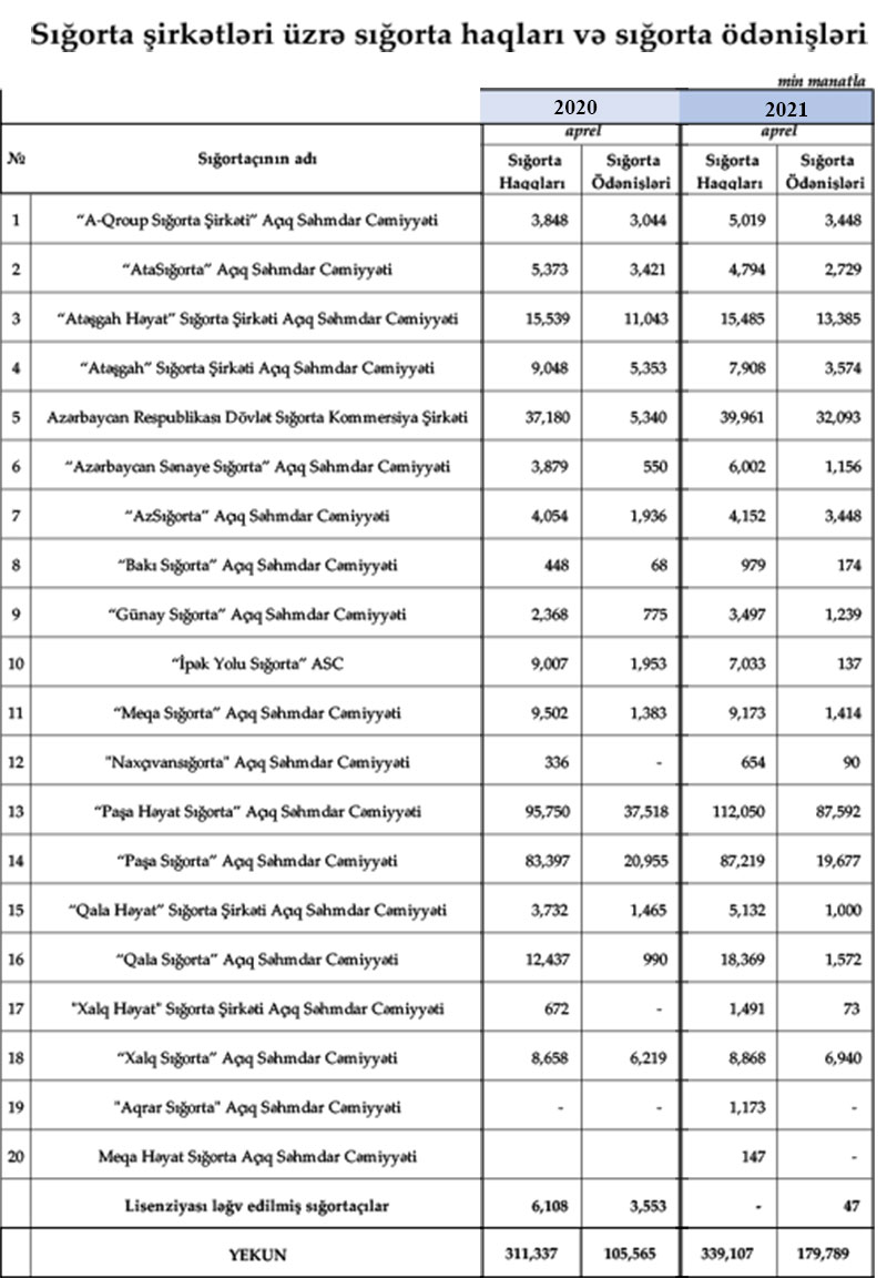 Marja xəbər verir ki, 2020-ci ilin ilk 4 ayı ilə müqayisədə 2021-ci ilin ilk 4 ayında “AtaSığorta”, “Atəşgah Həyat”, “Atəşgah Sığorta”, “İpək Yolu Sığorta” və “Meqa Sığorta” şirkətlərinin hesabladığı sığorta haqları azalıb.