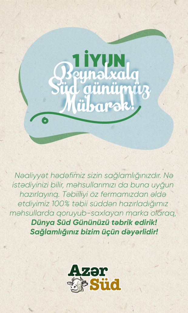(®️) “Azərsüd” markası Azərbaycan xalqını 1 iyun Ümumdünya Süd Günü münasibətilə təbrik edir. İllərdir fəaliyyət göstərən, keyfiyyəti və etibarlılığı ilə alıcıların zövqünü oxşayan “Azərsüd” hər kəsə sağlam ömür arzu edir.