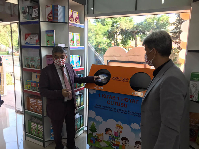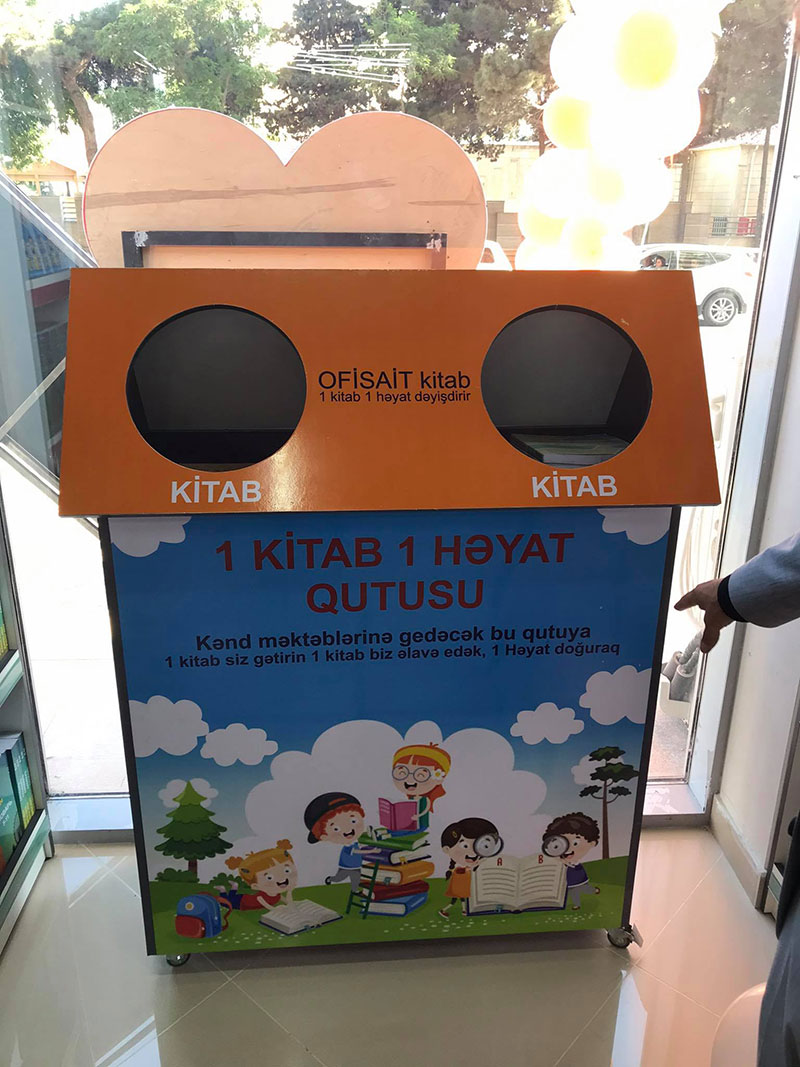 “Kitab Ofisait” mağazasında “1 kitab 1 həyat qutusu” yerləşdirilib. Belə ki, alıcıların bu qutuya yerləşdirəcəyi kitablar kənd məktəblərinin kitabxanalarına çatdırılacaqdır. Hər bir şəxs “Kitab Ofisait”dan aldığı və ya evindən gətirdiyi kitabı bu qutuya ata bilər. Qutuya atılan hər bir kitaba görə 1 ktab da “Kitab Ofisait” tərəfindən əlavə ediləcəkdir. Qutuya kitab yerləşdirən hər bir şəxsin adı, soyadı və telefon nömrəsi qeydə alınır. Ona kitabının hansı kənd kitabxanasına çatdırıldığı barədə məlumat veriləcəkdir.