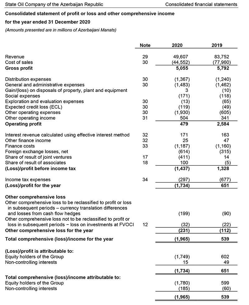 Dünya neft sənayesi tarixinin ən təlatümlü dövrü kimi yaddaşlarda qalan 2020-ci ildə SOCAR neft və qaz yataqlarının işlənməsi, karbohidrogenlərin nəqli və satışı seqmentlərində əldə etdiyi müsbət nəticələr hesabına üzləşə biləcəyi xalis zərəri azaltmağa nail olub.SOCAR 2020-ci ili 1 milyard 734 milyon manat xalis zərər ilə başa vurub. Halbuki, şirkət 2019-cu ili 651 milyon manat xalis mənfəət ilə bağlamışdı.