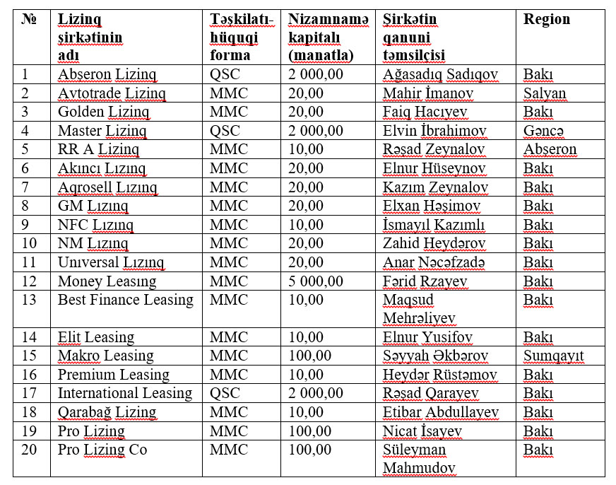 Bu ilin əvvəlindən 20 yeni lizinq şirkəti yaradılıb - SİYAHI