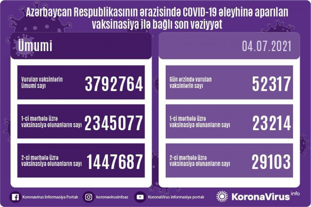 Ölkədə vurulan vaksinlərin ümumi sayı 3 792 764, birinci mərhələ üzrə vaksinasiya olunanların ümumi sayı 2 345 077, ikinci mərhələ üzrə vaksinasiya olunanların sayı isə 1 447 687 təşkil edir.