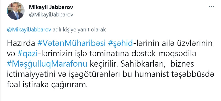 Bu barədə Azərbaycanın iqtisadiyyat naziri Mikayıl Cabbarov "Twitter" hesabında sahibkarlara, biznes ictimaiyyətinə və işəgötürənlərə çağırış da etmişdi.