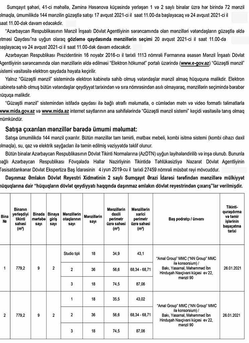 Marja xəbər verir ki, Sumqayıt şəhəri, Zəminə Həsənova küçəsində yerləşən 1 və 2 saylı binalar üzrə hər birində 72 mənzil olmaqla cəmi 144 təmirli mənzilin güzəştli satışı 17 avqust 2021-ci il tarixində başlayacaq.