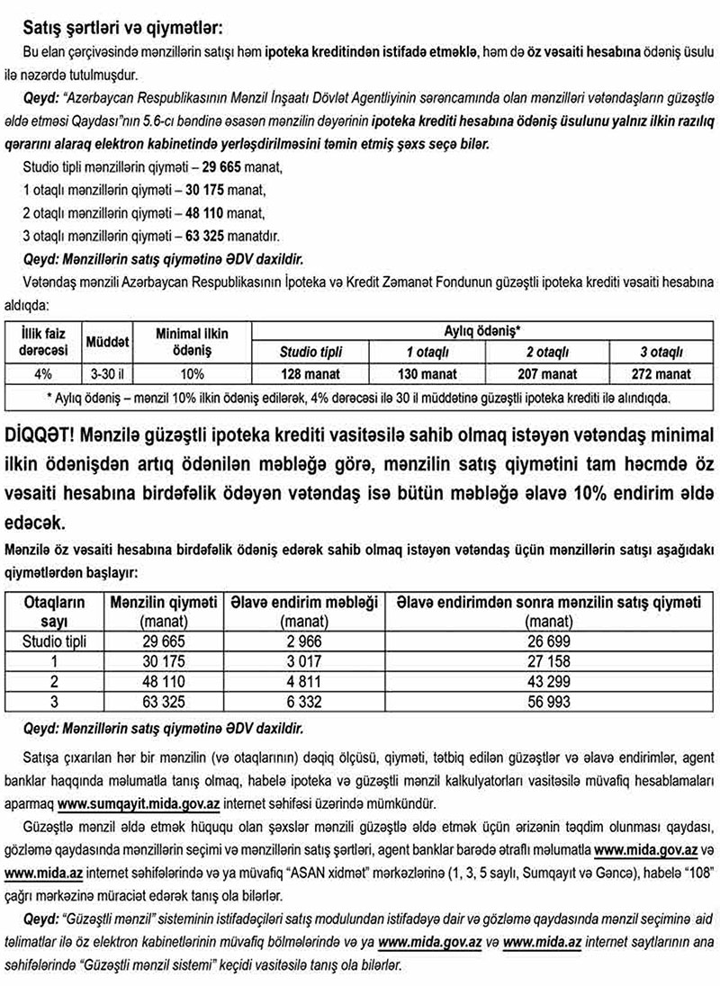 Azərbaycan Respublikasının Mənzil İnşaat Dövlət Agentliyi, növbəti layihəsi - Sumqayıt şəhərində inşa olunmuş binalarda yerləşən mənzillərin güzəştlə satışını elan edir.