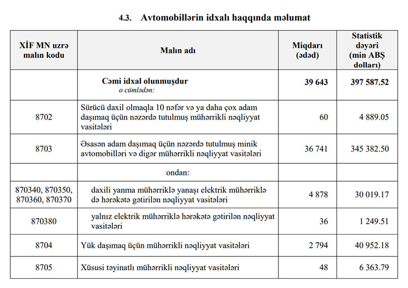 Qeyd edək ki, 2020-ci ilin yanvar-iyun aylarında Azərbaycana 289 milyon 912 min dollar dəyərində 23 min 413 ədəd avtomobil idxal edilmişdi.