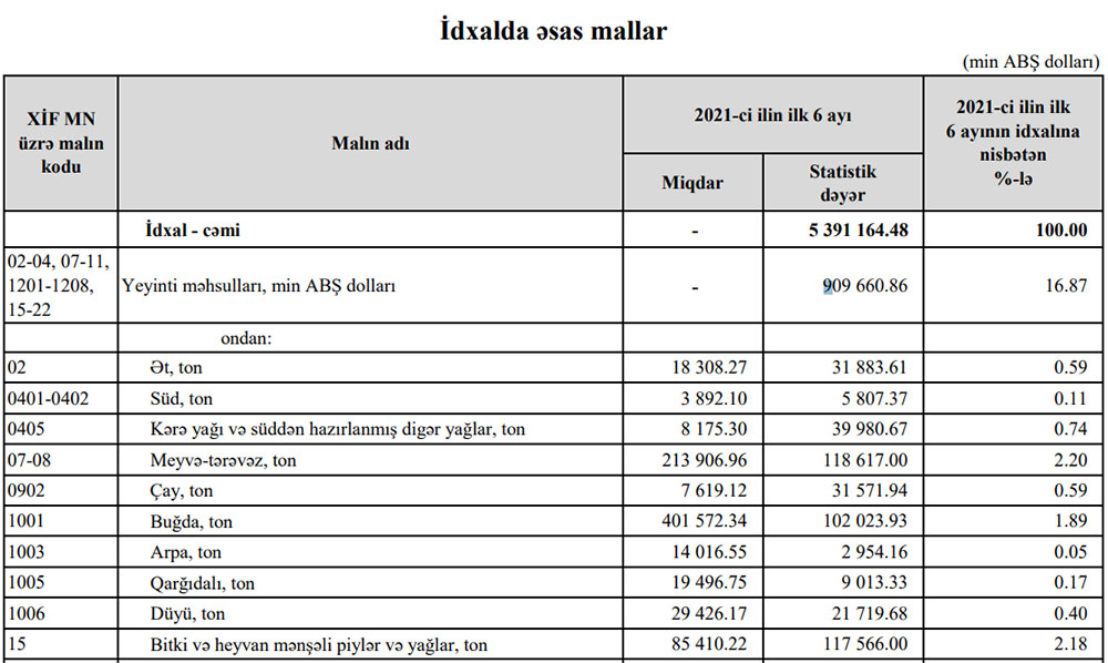 6 aylıq buğda idxalı 78 milyon 389 min dollardan 102 milyon 23 min dollara, bitki yağları idxalı isə 77 milyon 408 min dollardan 117 milyon 566 min dollara yüksəlib. Buğda və bitki yağları idxalının statistik dəyərinin artımı ilə müqayisədə miqdar ifadəsilə artım az olub. Statistik dəyərin artması dünya bazarlarında qiymətlərin qalxması ilə əlaqədardır.
