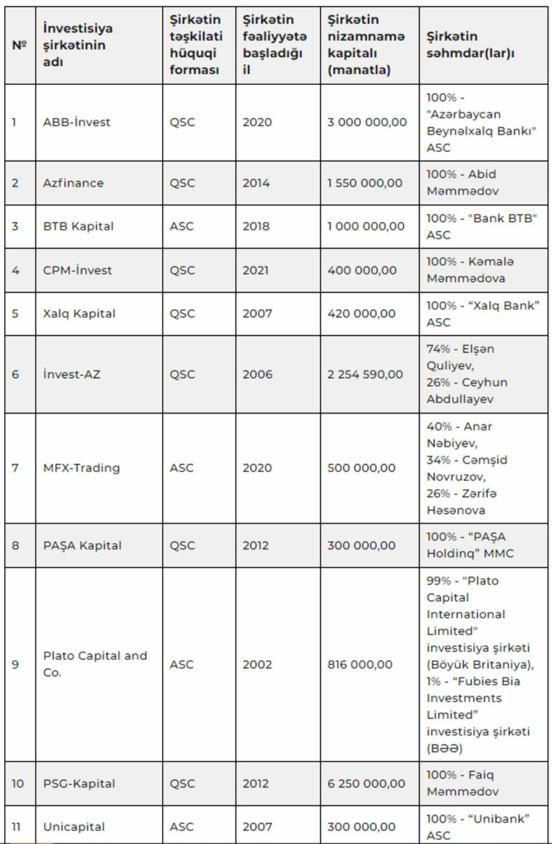 Hazırda Azərbaycanın qiymətli kağızlar bazarında 11 investisiya şirkəti fəaliyyət göstərir ki, bunlardan da 5-i fiziki şəxslərə məxsusdur.