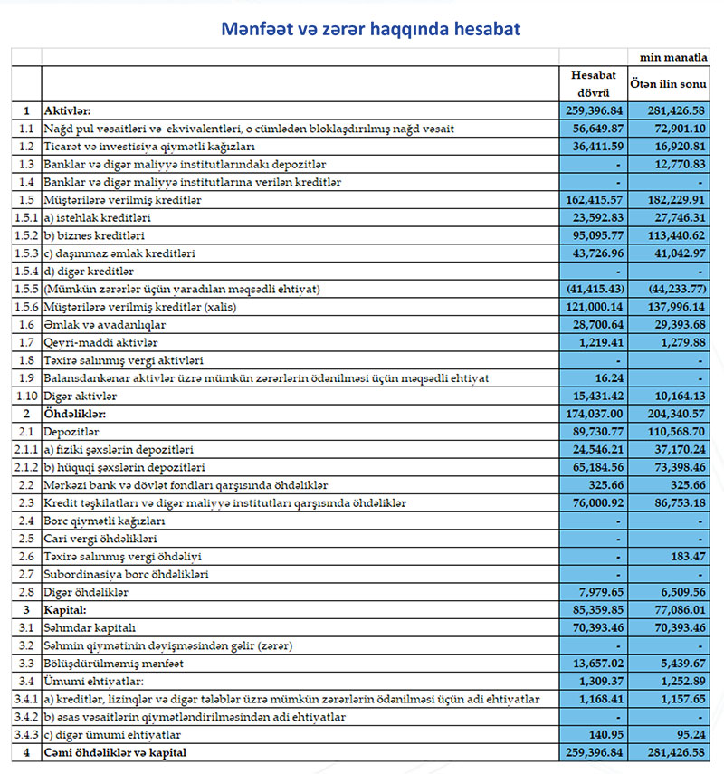 Müqayisə üçün qeyd edək ki, 2020-ci ilin birinci yarısında “AFB Bank”ın cəmi əməliyyat gəlirləri 17 milyon 900 min manat, cəmi əməliyyat xərcləri 9 milyon 653 min manat, gəlirlər xərcləri üstələdiyindən əməliyyat mənfəəti 8 milyon 247 min manat təşkil etmişdi. Əməliyyat mənfəətindən 5 milyon 24 min manat mümkün zərərlər üçün yaradılan məqsədli ehtiyatlara ayrıldığından Bank həmin dövrü 3 milyon 223 min manat xalis mənfəət ilə bağlamışdı.