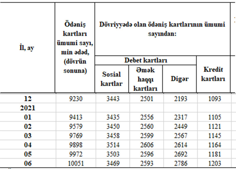 İyun ayında sosial kartların sayı 34 min ədəd azalaraq 3 milyon 469 min ədədə, əməkhaqqı kartlarının sayı 3 min ədəd azalaraq 2 milyon 593 min ədədə düşüb, sosial və əməkhaqqı kartı olmayan digər debet kartlarının sayı 94 min ədəd artaraq 2 milyon 786 min ədədə, kredit kartlarının sayı isə 22 min ədəd artaraq 1 milyon 203 min ədədə çatıb.