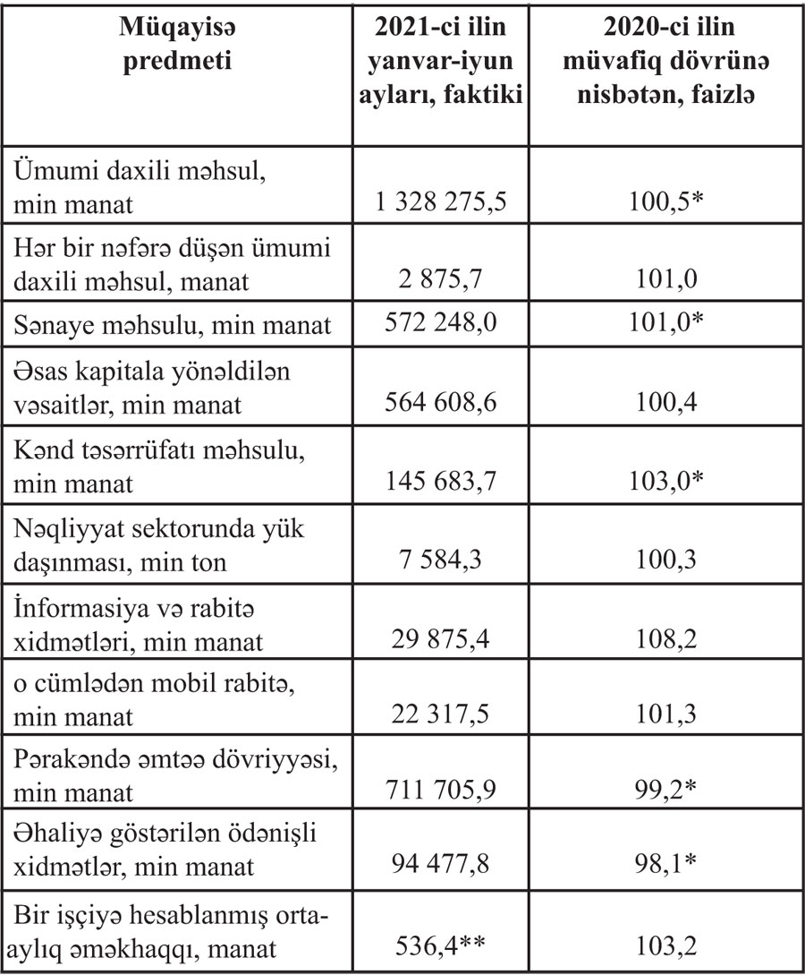 2020-ci ilin müvafiq dövrü ilə müqayisədə 2021-ci ilin ilk yarım ilində sənaye məhsulu 1 faiz, əsas kapitala yönəldilən vəsaitlər 0,4 faiz, kənd təsərrüfatı məhsulu 3 faiz, nəqliyyat sektorunda yük daşınması 0,3 faiz, informasiya və rabitə xidmətləri 8,2 faiz artmışdır.