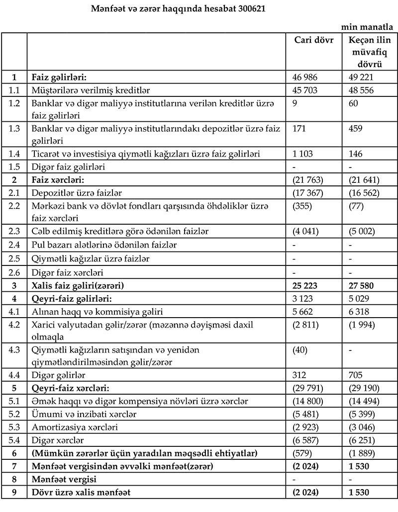 2021-ci ilin 1-ci yarısında “AccessBank”ın cəmi əməliyyat gəlirləri (faiz və qeyri-faiz gəlirləri) 50 milyon 109 min manat, cəmi əməliyyat xərcləri (faiz və qeyri-faiz xərcləri) 51 milyon 554 min manat təşkil edib. Depozit faizlərinin ödənilməsi üzrə xərclərinin yüksək olması və mümkün zərərlər üçün yaradılan məqsədli ehtiyatlara ayırma ilə əlaqədar olaraq Bank ilk 6 ayı 2 milyon 24 min manat xalis zərər ilə bağlayıb. “AccessBank”ın müştərilərə verdiyi kreditlər və qiymətli kağızlara investisiyaları artdığından qarşıdakı dövrlərdə Bankın faiz gəlirlərinin artacağı və xərclərini artıqlaması ilə ödəyəcəyi gözlənilir.
