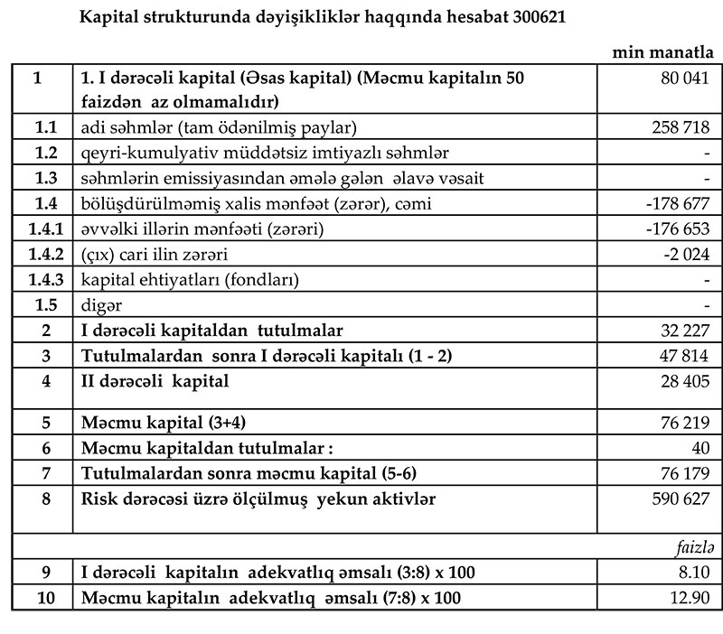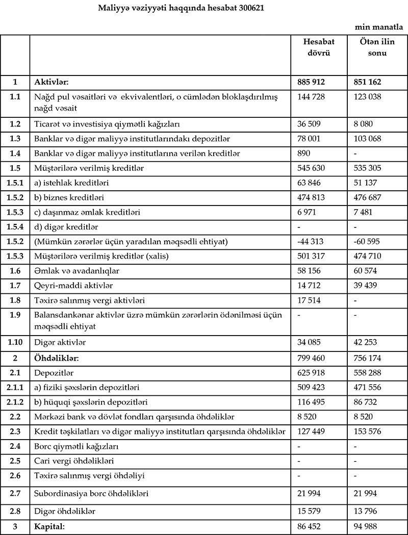 "AccessBank" 30 İyun 2021-ci il tarixində 76 milyon 179 min manat məcmu kapitala malik olub, bu da minimal tələbdən (50 milyon manat) çoxdur.