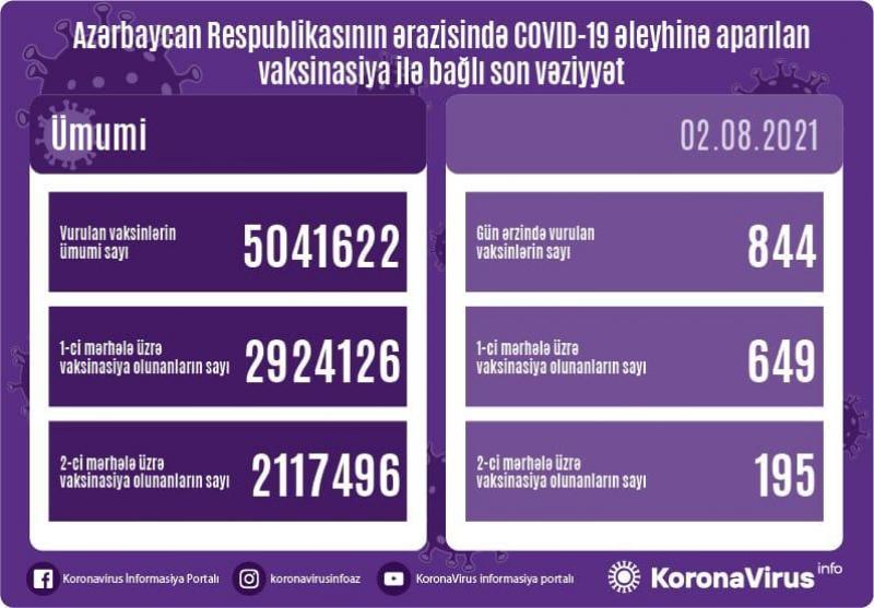 Azərbaycanda son sutkada koronavirus (COVID-19) əleyhinə 844 vaksin vurulub.